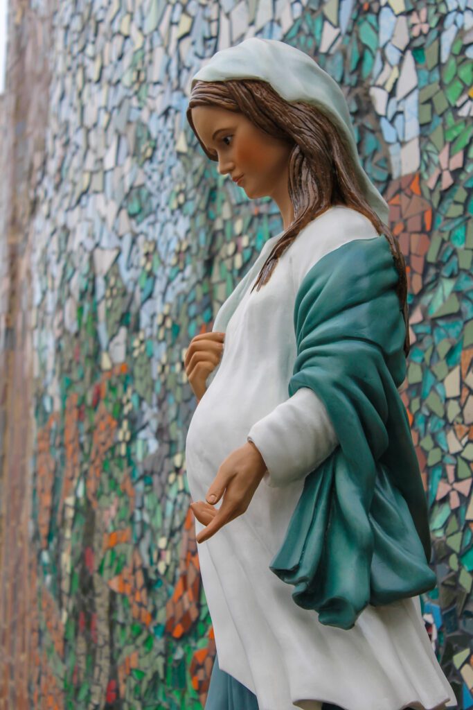 In these last weeks leading up to His birth, I am drawn to a statue a friend gave me as I was about to have our 8th child. It is a statue of The Blessed Mother visibly pregnant with baby Jesus. I had never seen this particular statue before, and I fell in love with it as soon as I opened it. In ordinary time the statue sits on the bookshelves in our main living space where we can see Her daily. During Advent I move Her to the center of the Advent wreath on the dining table where we eat our meals.